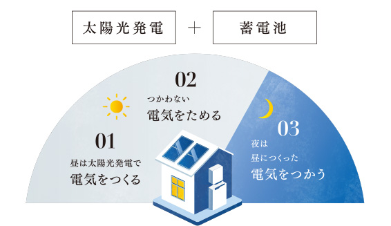 太陽光発電と蓄電池があり、日中は太陽光による発電で電気を使用することができ、日中の余剰電力を蓄電池にためて夕方や夜間に使用することができるので長期間の停電でも安心です。