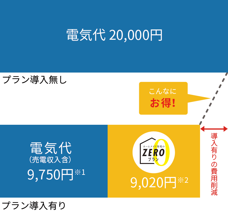 プラン導入後の電気代削減効果が大きいため、月々の支払を入れても、導入前よりも経済効果があり、長期間にわたって家計負担の差額となります。