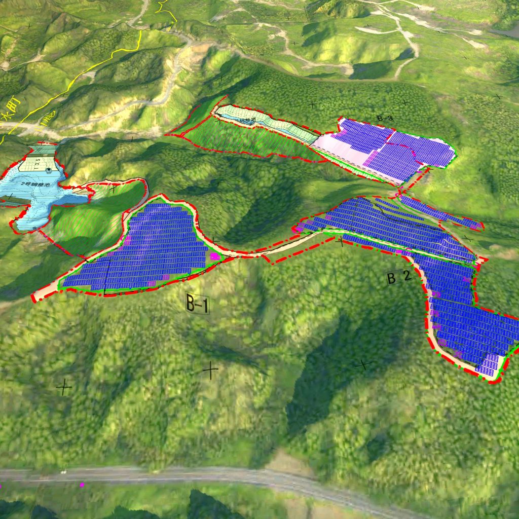②自社開発の3次元架台「スマートアレイ」により、造成を最小限にし、地形に合わせ3カ所にパネルを分散設置しました。