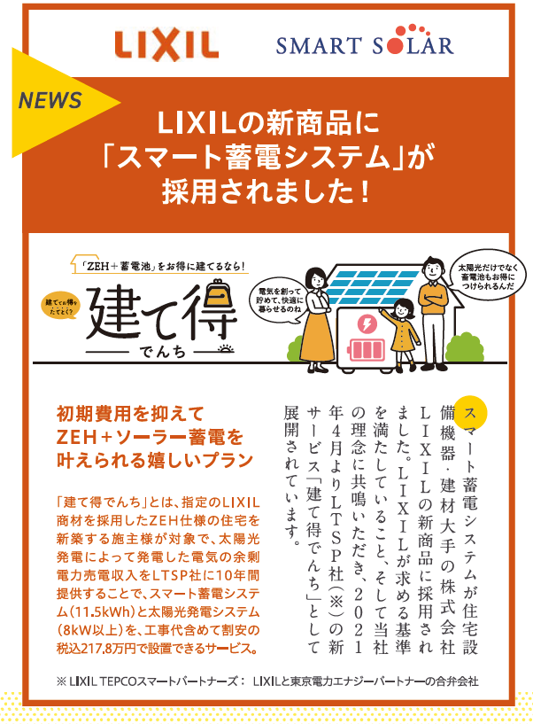 ■「スマート蓄電システム」が 株式会社LIXILの新商品として採用され 新サービス「建て得でんち」として展開 - 2022