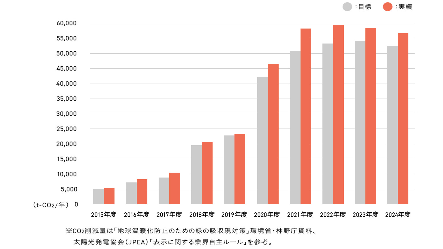 環境への取組み 社会課題の解決へ向けた活動を推進しています。 2024年度 CO2削減目標 53,242 t – CO2 /年 ※CO2削減量に関しては「地球温暖化防止のための緑の吸収現対策」環境省・林野庁資料、太陽光発電協会(JPEA) 「表示に関する業界自主ルール」を参考。