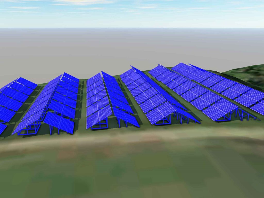当発電所の最大の特徴は、太陽電池パネルを東西配置し、通常の南向けの配置に比べ、敷設率を高めることで発電量を約20%向上させました。