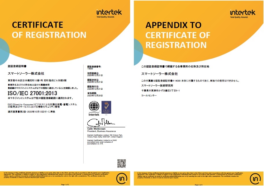 スマートソーラー株式会社は、情報セキュリティマネジメントシステムに関する国際規格である「ISO27001」の認証を2020年12月21日に取得(認証登録番号:14089)いたしましたことをお知らせいたします。