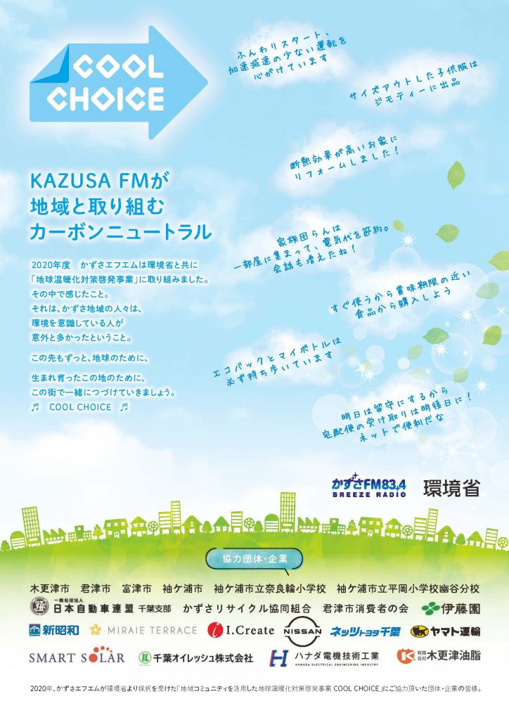 かずさFMが環境省より採択を受けた「地域コミュニティを活用した地域温暖化対策啓発事業 COOL CHOICE」への協力企業として、番組での紹介ならびにフリーマガジン「TO.KO.TO.N」への社名ロゴを掲出いただきました。