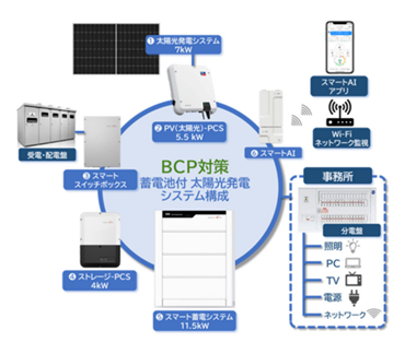 オンサイト型PPA※3では、設備導入のイニシャルコストを抑えるため、蓄電システムを設置しないことが一般的ですが、当社が開発した経済的な「スマート蓄電システム(蓄電池容量11.5kWh×2台)計23kWh」を導入することで、停電時でも施設内の重要オフィスエリアの通信・PC・照明機器に電力を供給できるため、BCP(事業継続計画)対策としての機能を果たす点が特長になります。