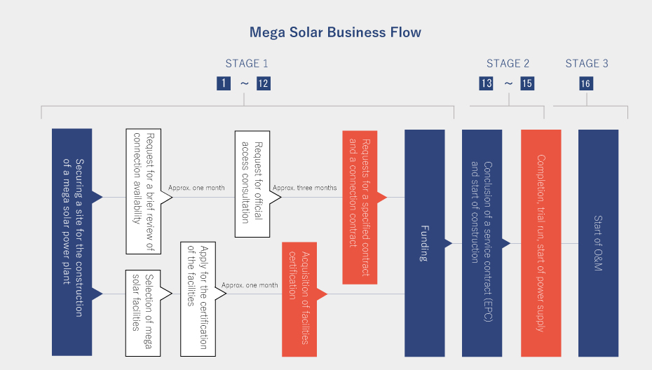 A wide range of planning and development operations are involved in the completion of a photovoltaic power station: acquisition of a site, consultation with the Ministry of Economy, Trade and Industry and electric power companies, compliance with laws and regulations, acquisition of permits and licenses, obtaining the understanding of community residents, and raising funds from investment partners and financial institutions. After the completion of these procedures, construction of the power station starts and where our company supervises the quality of the construction work and design. Our company implements full testing, starts the 20-year electricity selling business, and operates and maintains the station to maintain optimal performance. Smart Solar Corporation handles development, construction supervision, and the operation of mega photovoltaic stations of various scales from Hokkaido to Kyushu.