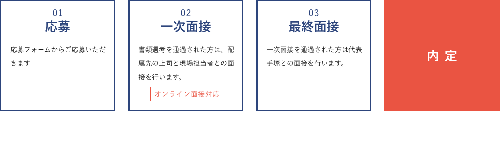 選考プロセスは3つです。面接に関するご質問等はお気軽にお問合せください。
