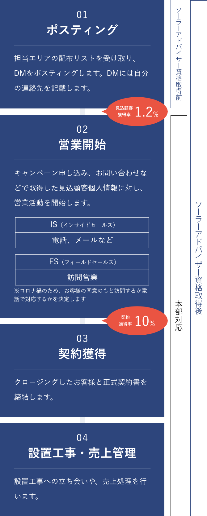 2. SAは担当エリアにおいて、弊社の顧客データーベースから卒FIT(住宅の場合10年の固定買取修了者)情報をもとに提案ポスティングを行い、本社コールセンターと共同して蓄電システム~太陽光~電力取引などのサービスを提供します。