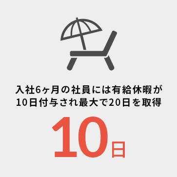 年間最大20日の有給休暇が取得できます。(新入社員は入社6か月後より)