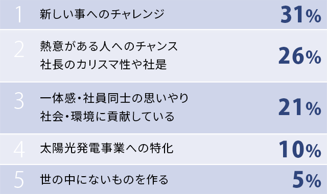 環境貢献に対する熱意、その熱意に賛同し集まった専門知識を持った社員の方々、会社全体が太陽光のエネルギーを活用し世の中を良くしていこうと熱意のある会社。
