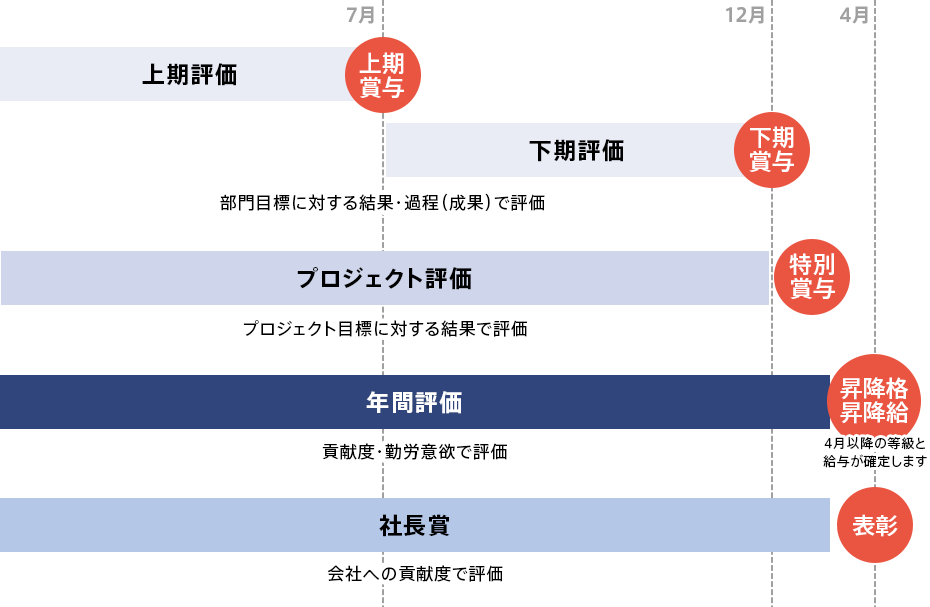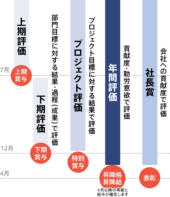 仕事で結果を出すためには「熱意」「能力」「考え方」の3つの要素が重要と考えており、それらの要素が仕事で十分に発揮されているか磨かれているか各評価においてみています。