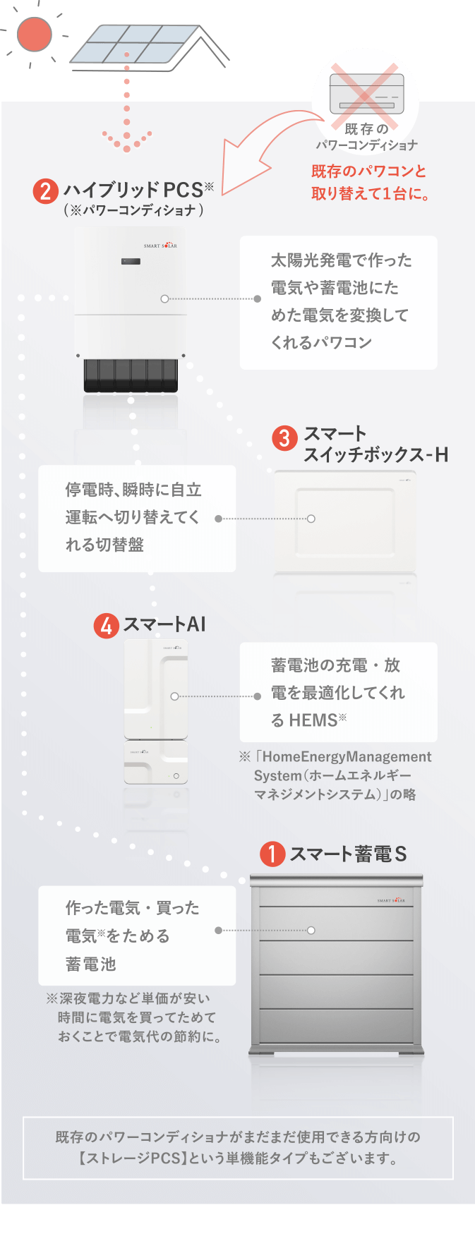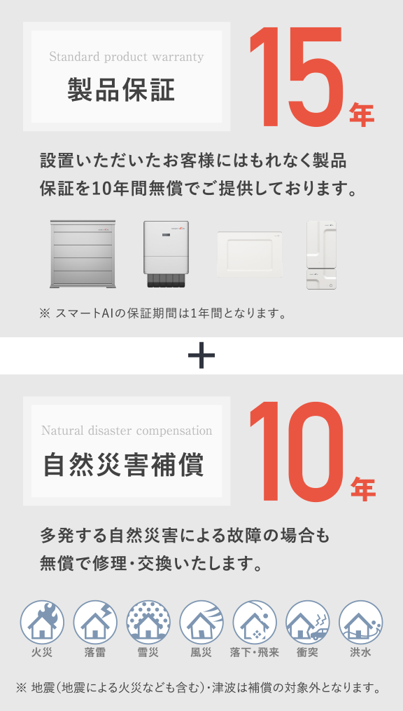 本特典は、スマート蓄電システムをご購入頂いた方が対象となります。お申込みはご契約時のみとなり、それ以降のお申込みはできません。自然災害への補償は10年間のみで延長制度はありません。本特典はお一人1様回限りとさせていただきます。<製品保証5年間延長無償>への応募期間は2021年4月1日~5月28日まで。本特典の対象機器はスマート蓄電システム『ハイブリッドシステム-S』となります。スマートAIは対象外となります(スマートAIの保証期間は一年間です)。本キャンペーンの対象者は太陽光発電システム10kW未満・固定価格買取期間10年間の方になります。