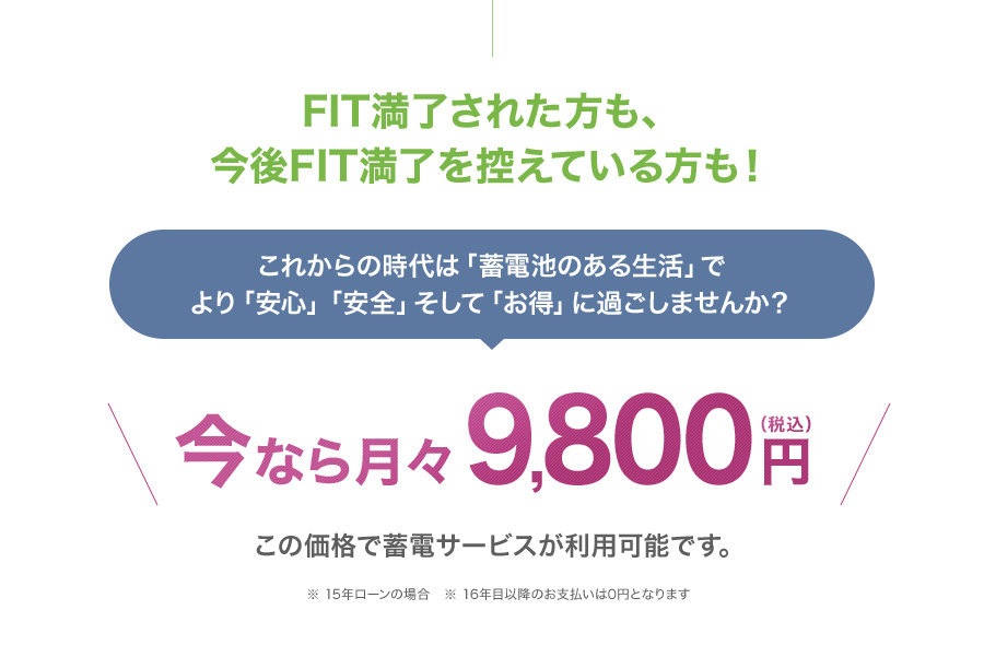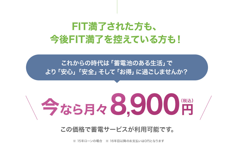 蓄電システムご購入時に当社指定の条件(15年間/180回/固定金利1.9%)で分割払いをご選択いただきます。お支払いは当社指定の信販会社を通じて実施いただきます。信販会社より事前審査をお受けいただきます(条件によっては分割払いでのお支払いができない場合がございます)。