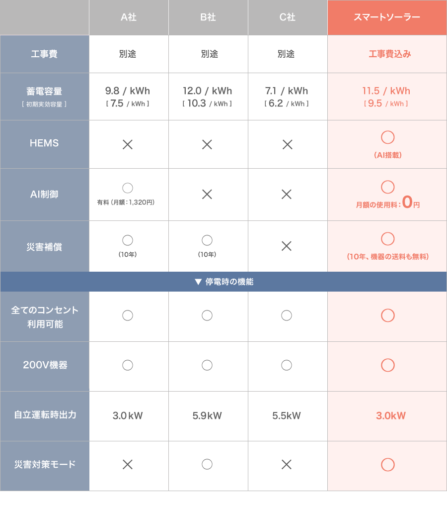蓄電システムご購入時に当社指定の条件(15年間/180回/固定金利1.9%)で分割払いをご選択いただきます。お支払いは当社指定の信販会社を通じて実施いただきます。信販会社より事前審査をお受けいただきます(条件によっては分割払いでのお支払いができない場合がございます)。