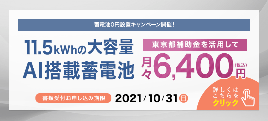本特典はお一人様1回限りとさせていただきます。本特典はご応募いただいたご本人様のものとし、他人への譲渡、換金はできません。沖縄、離島を除く国内設置のみが対象です。本キャンペーンの対象者は太陽光発電システム10kW未満・固定価格買取期間10年間の方になります。次の場合はいずれのご応募も無効となりますので、ご注意ください。ご連絡先の内容に不備がある場合。ご連絡先登録完了後に住所変更のご連絡がない場合。お客様のご住所が不明・連絡不能などの理由により賞品がお届けできない場合。現場調査の結果により、スマート蓄電システムが設置できない場合。その他、ご応募に関して不正な行為があった場合。
