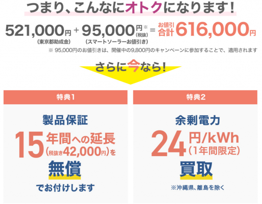 スマートソーラー株式会社(東京本社:東京都中央区、代表取締役社長:手塚博文、以下当社)は、既に家庭用太陽光発電システムを設置され、FIT(固定価格買取制度)期間中または10年の買取期間が満了されたお客様向けに、東京都助成金521,000円と当社キャンペーン割引95,000円を併用し合計616,000円お値引としています。家庭用蓄電池「スマート蓄電システム」を実質959,200円(税込)で購入いただけるため、大変好評をいただいています。