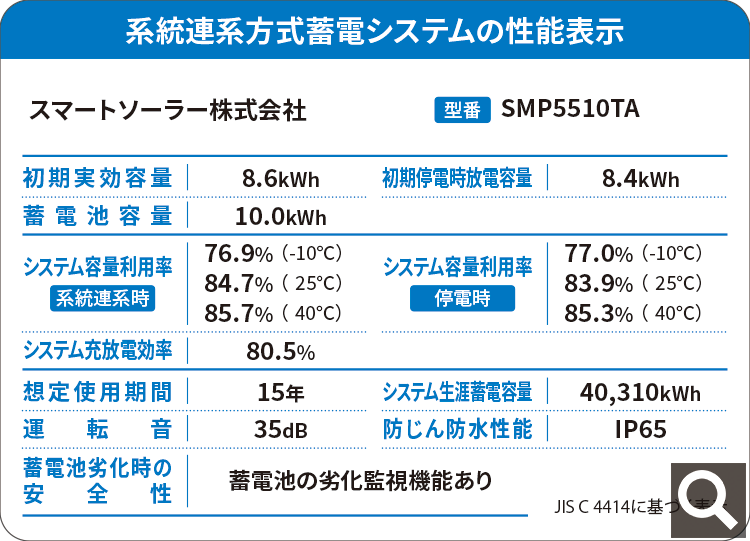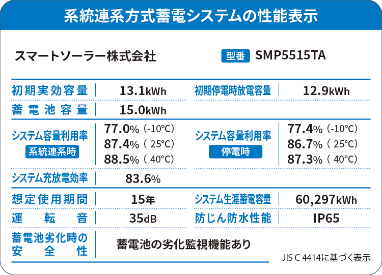 性能表示ラベルについては、一般社団法人 日本電機工業会(JEMA)「蓄電システム 性能表示ラベルのススメ」をご参照ください。