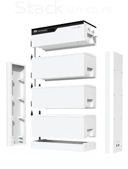 これまでの蓄電池の設置には、大型のトラックや狭い場所への運搬は困難でした。スタック構造にすることによって蓄電池を分割して運ぶことができるので、わざわざ運搬専門の業者に依頼することがなくなり、また、設置も楽になるため、従来の蓄電池で採用されている一体型に比べて、工事費用を抑えることができます。