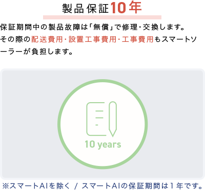 スマート蓄電システムを長期間、安心してお使いいただけるように、製品保証と自然災害補償を無償でご提供します。また、機器の送料の他、設置工事費用もスマートソーラーが対応するため、お客様への経済的なご負担も抑えさせていただきます。