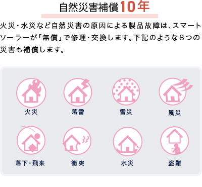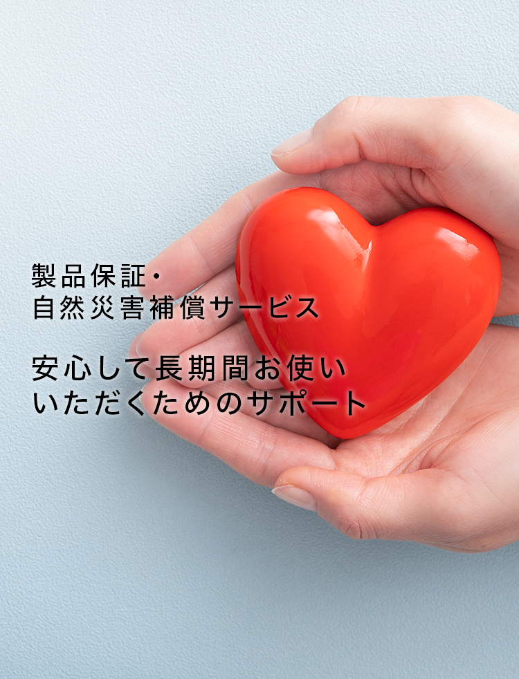 製品をご購入いただいたお客様に自然災害補償10年を無償でご提供しています。落雷や洪水等の自然災害による製品故障の際は、無償で修理・交換させていただきます。頻発する台風や大雨等による自然災害への備えとなるため、安心してお使いいただけます。