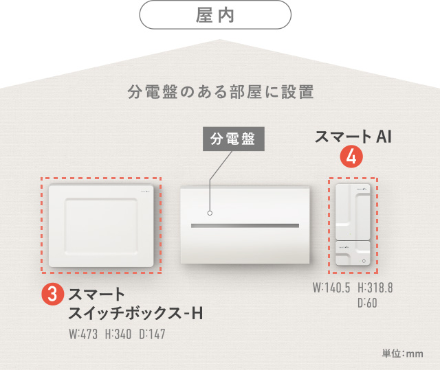屋内設置する③スマートスイッチボックス-Hの大きさは、横幅473mm・高さ340mm・奥行き147mm④スマートAIの大きさは、横幅140mm・高さ318mm・奥行き60mmとなり、分電盤の近くにそれぞれ設置されます。なお、スマートAIは上の測定ユニットと下のHEMSコントローラを分離できるため、スペースに合わせて柔軟な設置が可能です。