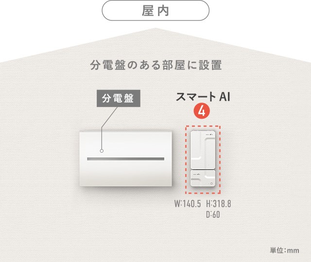 屋内設置するスマートAIの大きさは、横幅140mm・高さ318mm・奥行き60mmとなり、分電盤の近くにそれぞれ設置されます。なお、スマートAIは上の測定ユニットと下のHEMSコントローラを分離できるため、スペースに合わせて柔軟な設置が可能です。