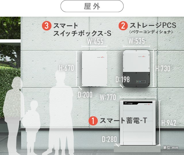 屋外設置する①スマート蓄電-Tの大きさは、横幅770mm・高さ942mm・奥行き280mm、②ストレージPCSの大きさは、横幅535mm・高さ730mm・奥行き198mm、③スマートスイッチボックス-Sの大きさは、横幅455mm・高さ670mm・奥行き200mmです。