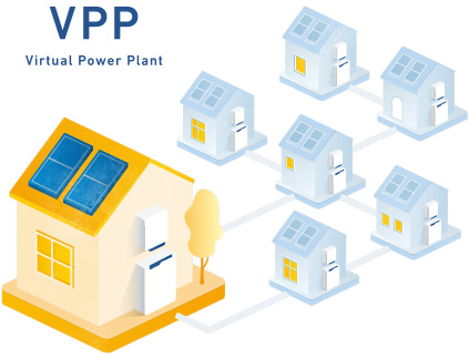 ※VPPとはバーチャルパワープラント(Virtual Power Plant)の略で、分散型エネルギーリソースを情報通信技術を活用して束ね、あたかも一つの発電所のように制御する技術のことです。複数の小規模発電設備を1つの発電所であるかのようにまとめて機能させることから「仮想発電所」とも呼ばれます。