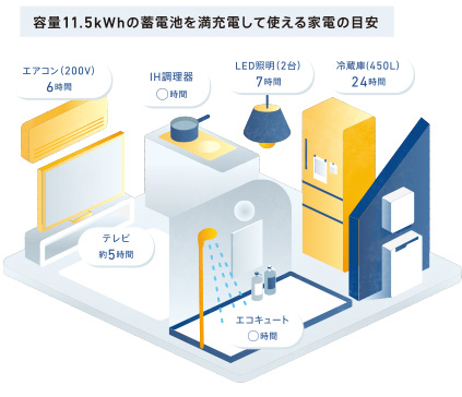 停電時でも、情報源となるTVやスマートフォン、冷蔵庫や調理、エアコン、入浴も可能となるため、赤ちゃんやご高齢の方がいる方でも、ミルクを作れたり寒暖をしのぐことができるので安心です。