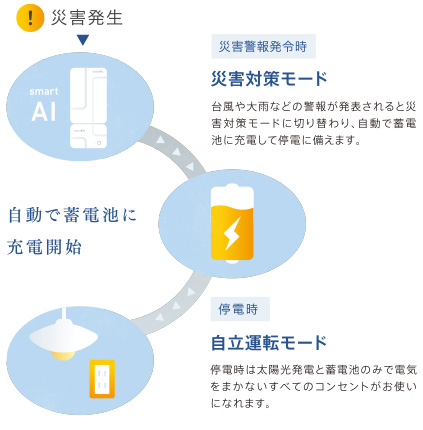 スマートAIは、停電が予想されるようなクラスの台風や暴風雨等の災害警報を受信すると、自動で蓄電池に充電を開始する災害対策モードとなり、停電に備えます。事前に停電リスクを察知する