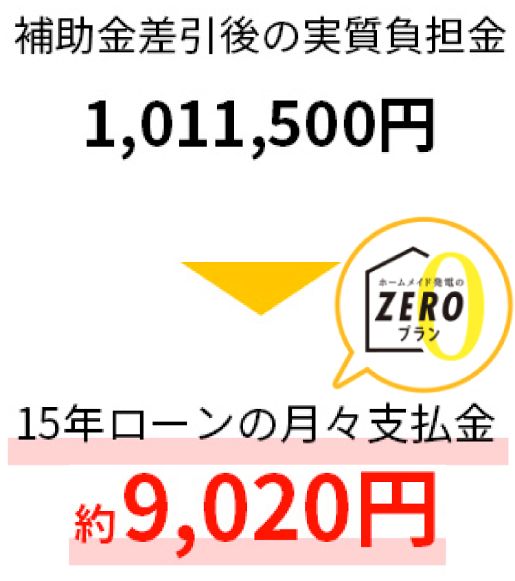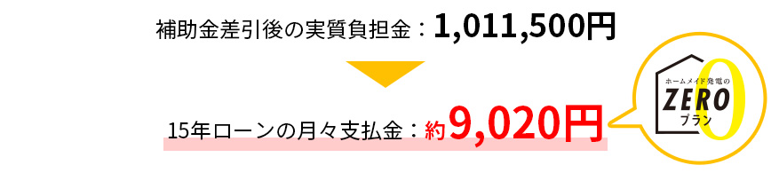 現時点で把握している、東京都の補助金を適用すると、ホームメイド発電のゼロプランなら頭金なしの15年の月々の支払が約9,020円となります。
