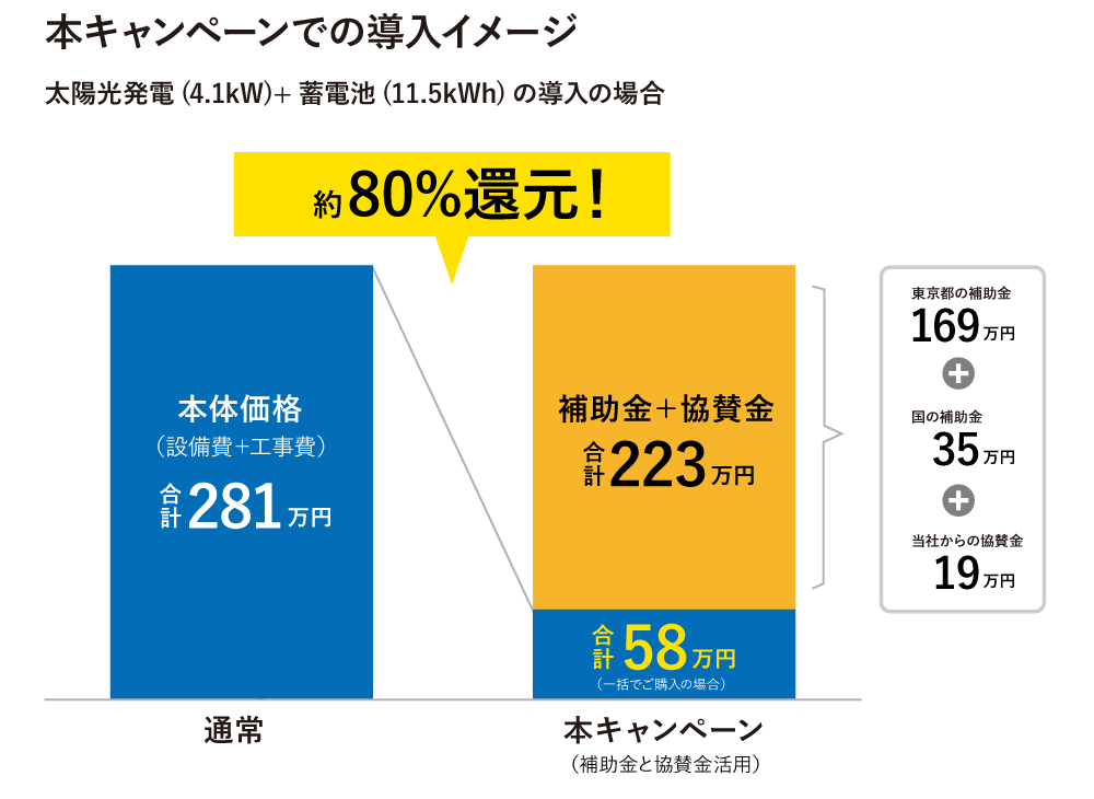 また、東京都と国の補助金と併用することで、ソーラー蓄電(太陽光4.1kW、蓄電池11.5kW、標準設置工事)が58万円(一括の場合)で導入可能となっております。