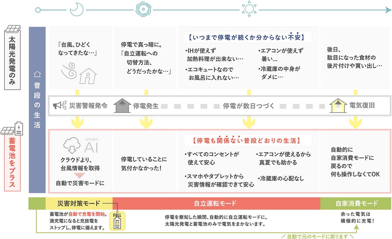 POINT災害による停電に備えて事前に蓄電池を満充電にするのが「災害対策モード」で、停電になった場合に太陽光発電と蓄電池からの電気を賄うのが「自立運転モード」です。いずれも、自動でモードが切り替わるので安心です。
