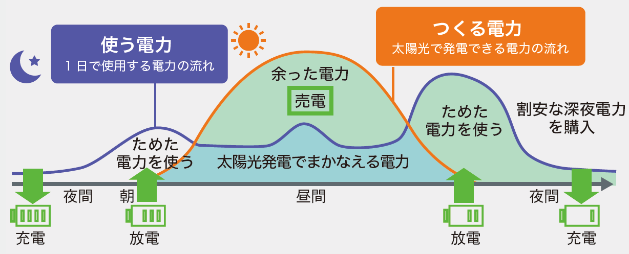 FIT期間中の方は、FIT満了まで売電収入による経済メリットを享受いただき、深夜の安い電力を蓄電池に溜め、太陽が出るまでの早朝などに蓄電池からの電気を活用できます。売電モードとは、深夜の安い電力を蓄電池に充電し、太陽光発電でつくった電力の余剰分はすべて売電するモードです。